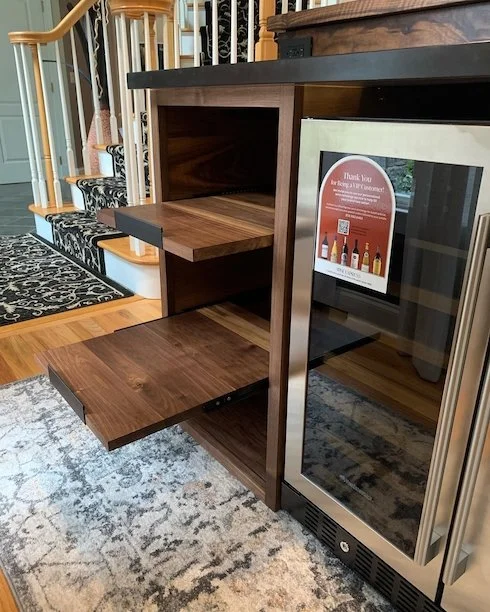 Pushing the boundaries of creativity. This six-foot Claro Walnut bar shows what custom handmade furniture should look like. The split-top design has a bar-height side for guests and a counter-height side for serving. Equipped with soft-close drawers, a french door wine fridge, and electrical for everyday needs.