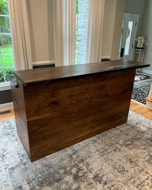 The bar tops are made from a single claro walnut slab with incredible shatoyancy that was cut in a way that presents the slab as “flowing” down one side to the other. The cabinet base is made from solid black walnut that has a beautiful grain color and sheen.