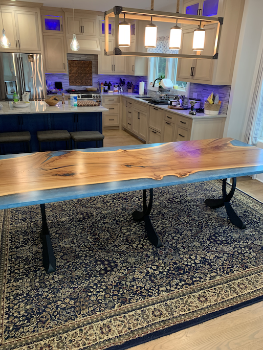 This nine-foot english elm dining table is the sister table to the ten-foot big leaf maple dining table. The client chose this slab for its beautiful brown and orange hughes. The long and wavy grain, along with the blue resin, compliments the coastal theme of the house nicely. The cast iron legs give the table a nice structure and modern aspect that also match the bar seats behind it; tying it all together.
