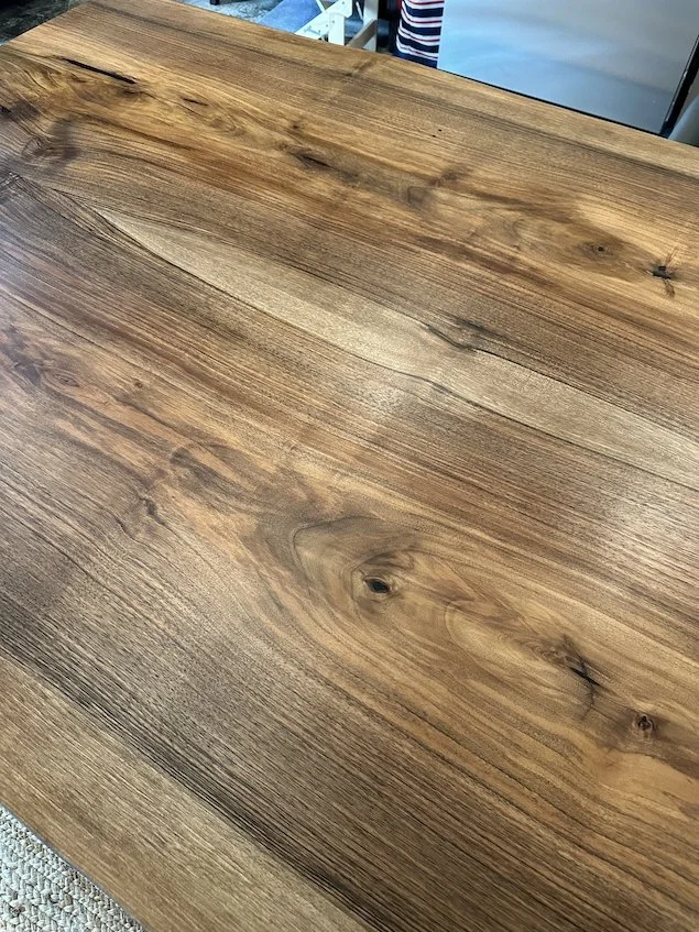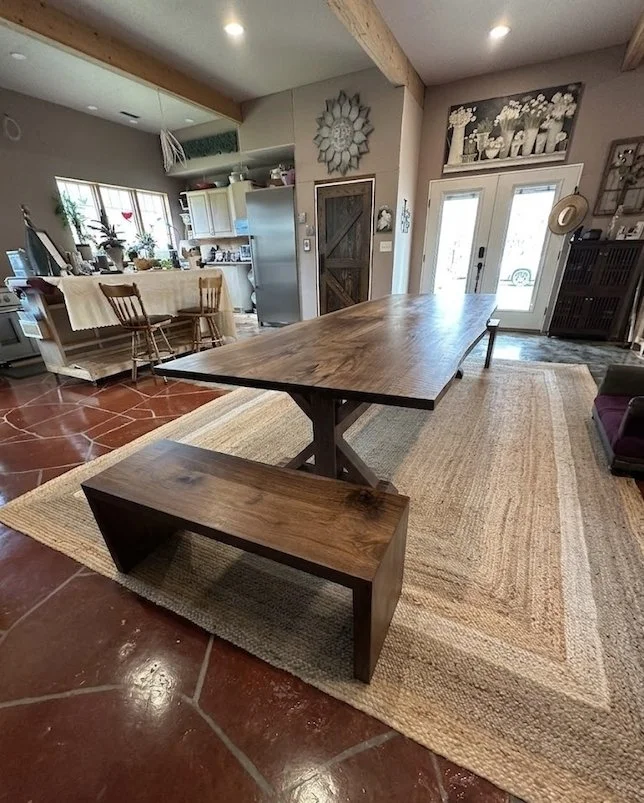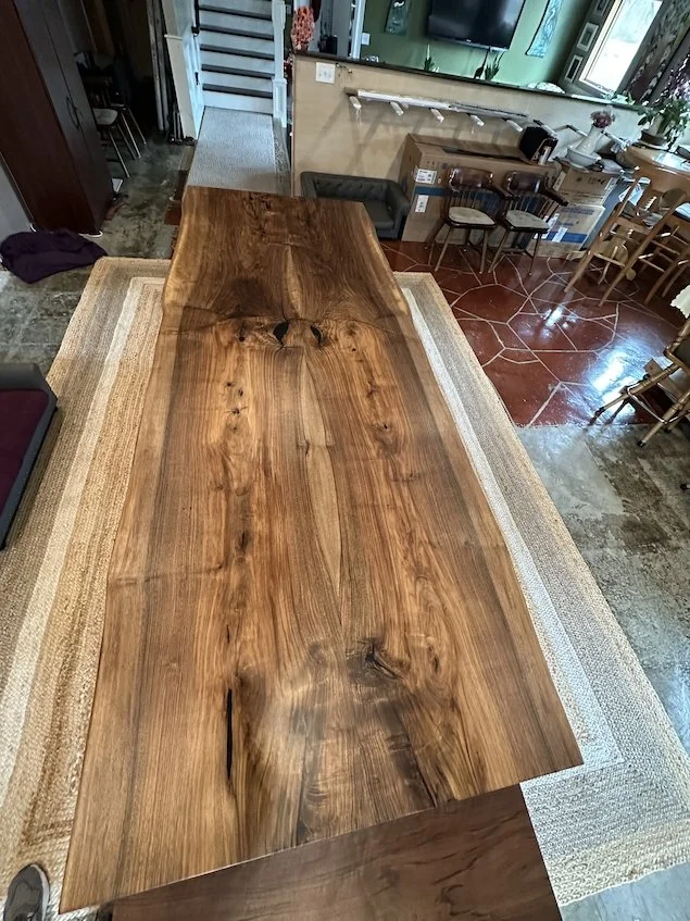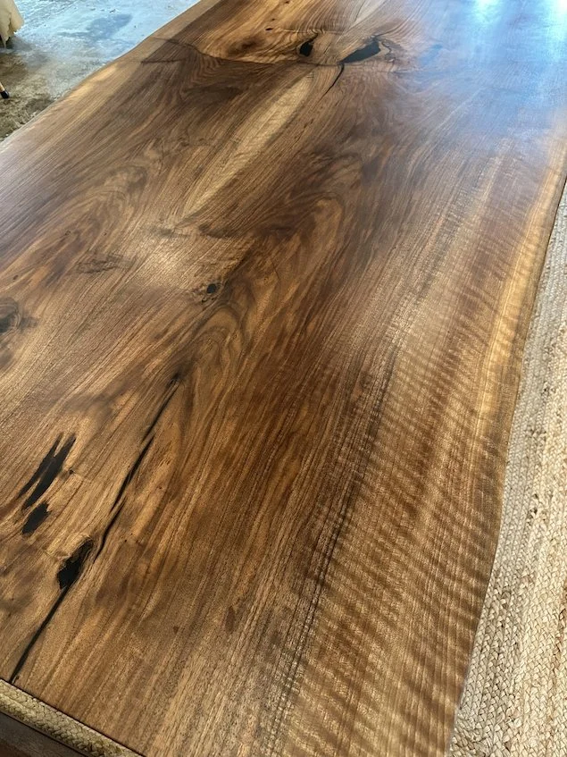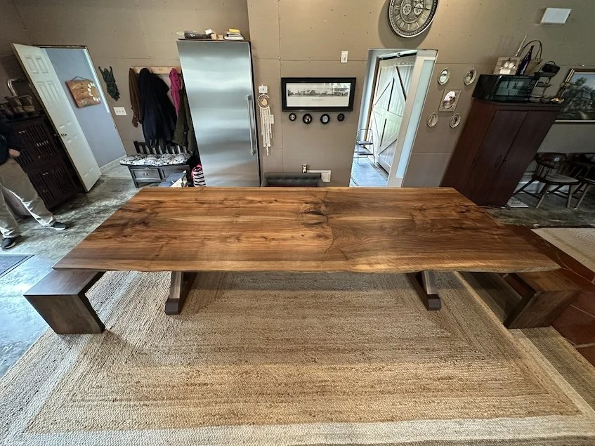 This client ordered a rare grafted, live-edge English Walnut bookmatched slab set for the dining table and placed it over a traditional trestle base made from black walnut. This kind of slab happens when an English walnut tree is cut and spliced onto another walnut variety such as Claro Walnut when both trees are young. The result is an interesting grain line in the middle showing the difference in color and character between the species. It has incredible figuring in the lower half and warm browns above the grain line. It’s paired with custom waterfall benches also made from English Walnut slabs.