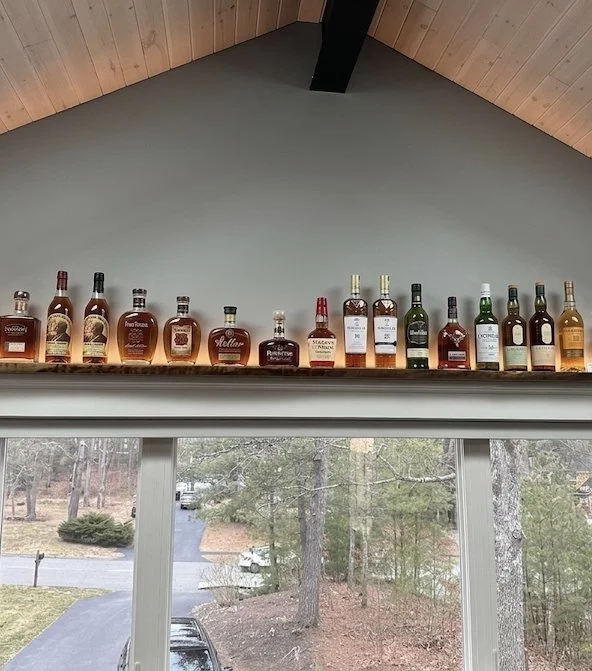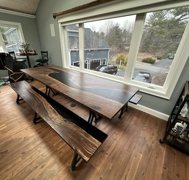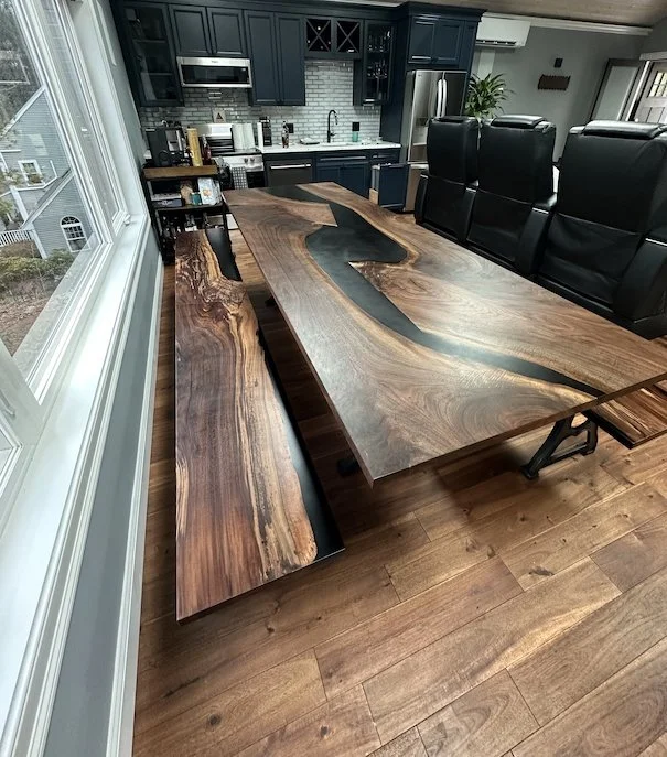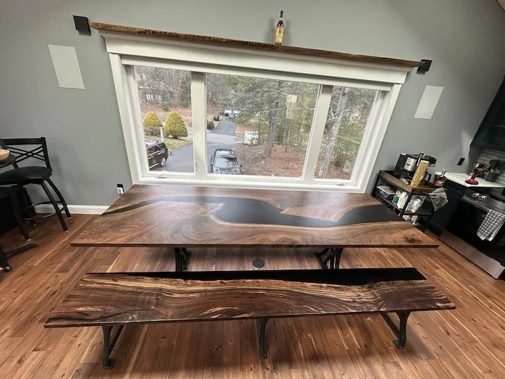 I finally had the chance to use this unique claro walnut slab. I’ve had my eye on it for some time and this client’s furniture package put it to great use. Comprised of a beautiful black river table and matching benches over cast iron legs, it completes a stylish man-cave above the garage. Plus, a live-edge walnut bourbon shelf perched on top of the window will sure to be a conversation starter.