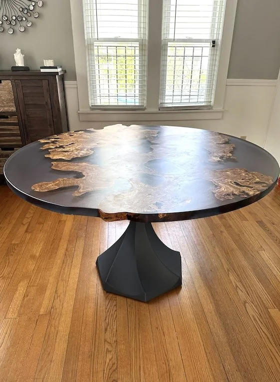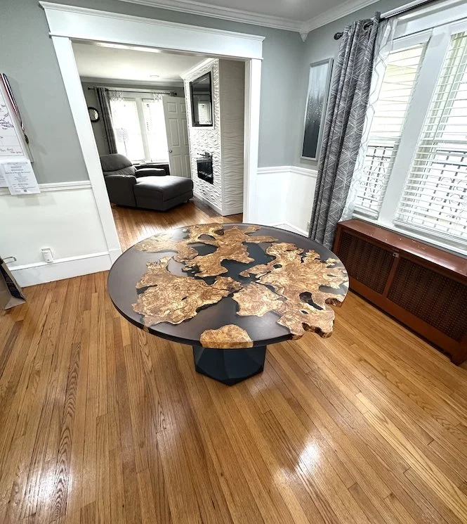 The client wanted everything about everything custom with this table. A ton of character in the wood, lots of holes and irregular edges, black tinted resin, a semi-live edge profile, and an elegant metal base to tie it all together. This was truly a favorite project of mine to make, especially because the wood smells like olive oil!