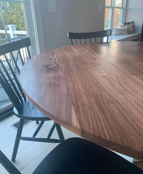 This solid walnut round table adds a beautiful warmth to this mountainside home. Colonial-style black spindle chairs compliment this table nicely.