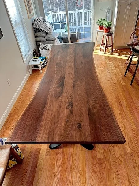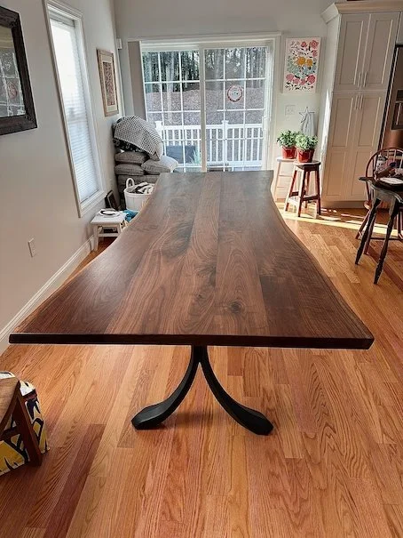 This subtle live-edge walnut table boasts beautiful deep brown and almost purple hues with a beautiful grain pattern. The three powder coated “wishbone” legs add a nice elegance to the table.