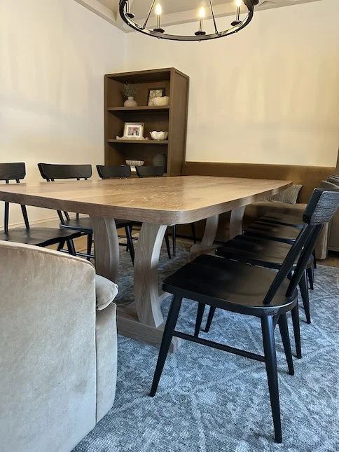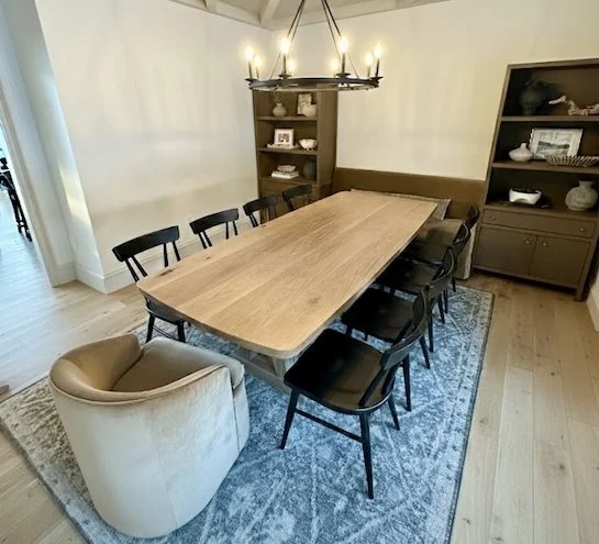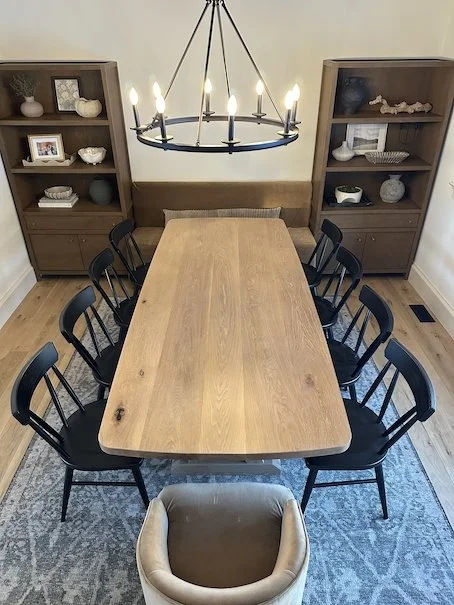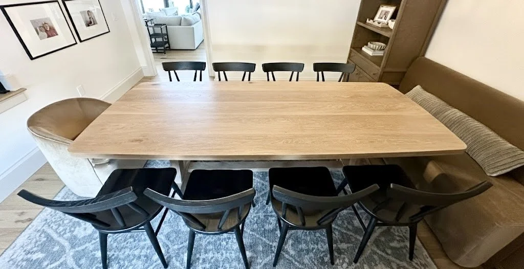 This natural white oak table has a touch of timeless figure in a modern house. It has a custom faux-oval profile with rounded corners that can seat an impressive ten people, perfect for gatherings. The base is a custom curved trestle design that will support this table forever.